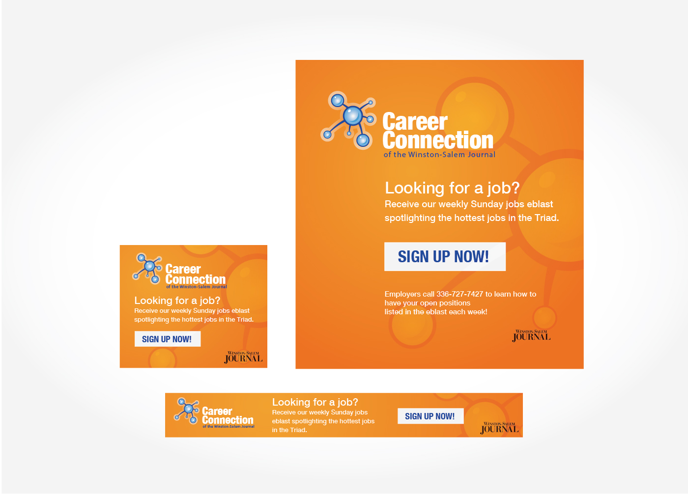 Career Connection was an identity given to the "Jobs" section of the Winston-Salem Journal web site. We needed to elevate the visibility of the listing service and increase participation. The deliverable to clients was a scheduled e-mail containing job listings matching the client's criteria along with recommendation of close matches. I created the logo, ads, email templates, and landing pages supporting the initiative