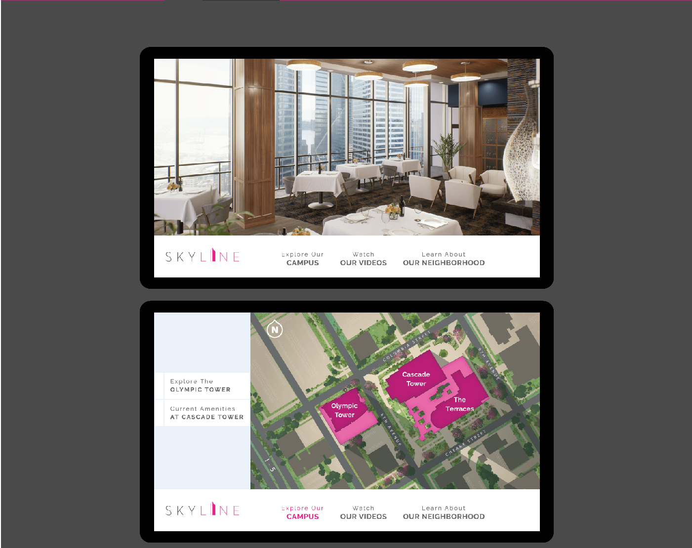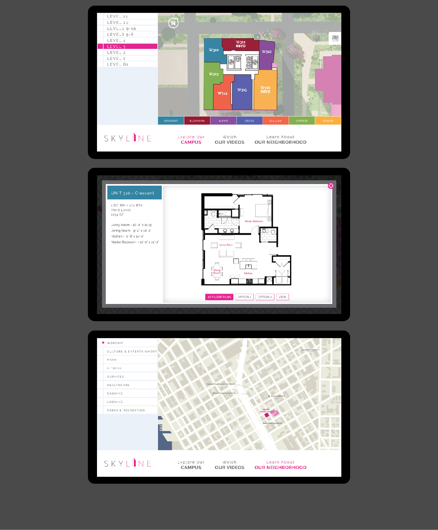 Skyline of Seattle is a retirement community within two high rise towers that offer a sweeping view of downtown Seattle. The sales kiosk is installed in the main office and is used by associates to guide customers to view available units and relevant information. The client needed the kiosk in order to sell units while one of the towers was still under construction. I worked closely with the architect, interior designers, and community planners to create the interactive map. I took the opportunity to render the landscaping with a set of Illustrator brushes that I developed especially for the project. I rendered surrounding cherry trees that happen to bloom in the client’s pink brand color. I also cleaned up level plans, and created a set of unit plans that are also be printed. I wrote the HTML, CSS/SCSS, PHP, XML, and Javascript/JQuery for the product. A companion app was developed for associates away from the main office.